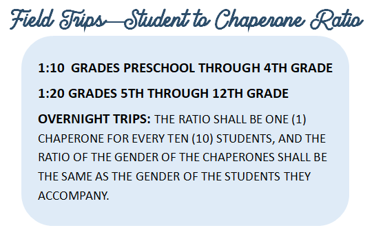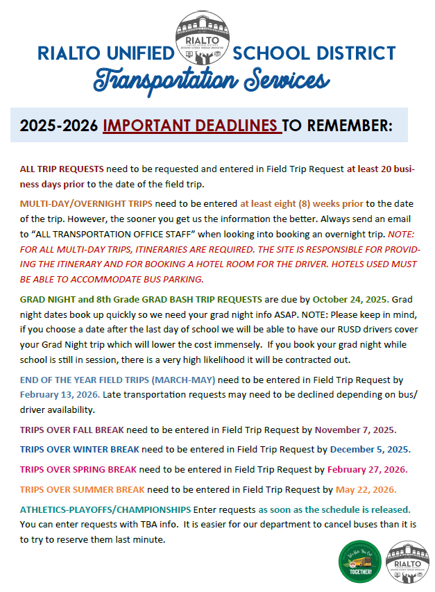 2025-2026 FIELD TRIPS - IMPORTANT DEADLINES TO REMEMBER